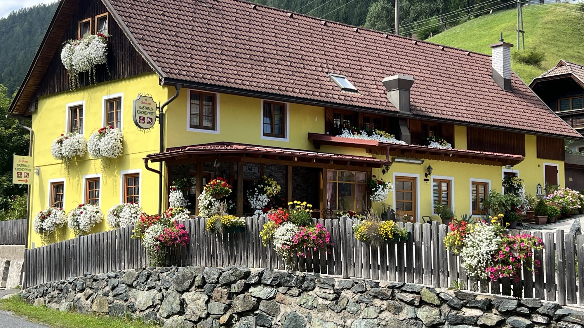 Es ging 6,5 km entlang des Baches immer nach oben, sodass wir am Ende knappe 400 Höhenmeter hinter uns gebracht hatten. Auf den Bus wartend haben wir beim Kirchenwirt in Windisch-Bleiberg etwas Kühles getrunken und einen Eispalatschinken gegessen.