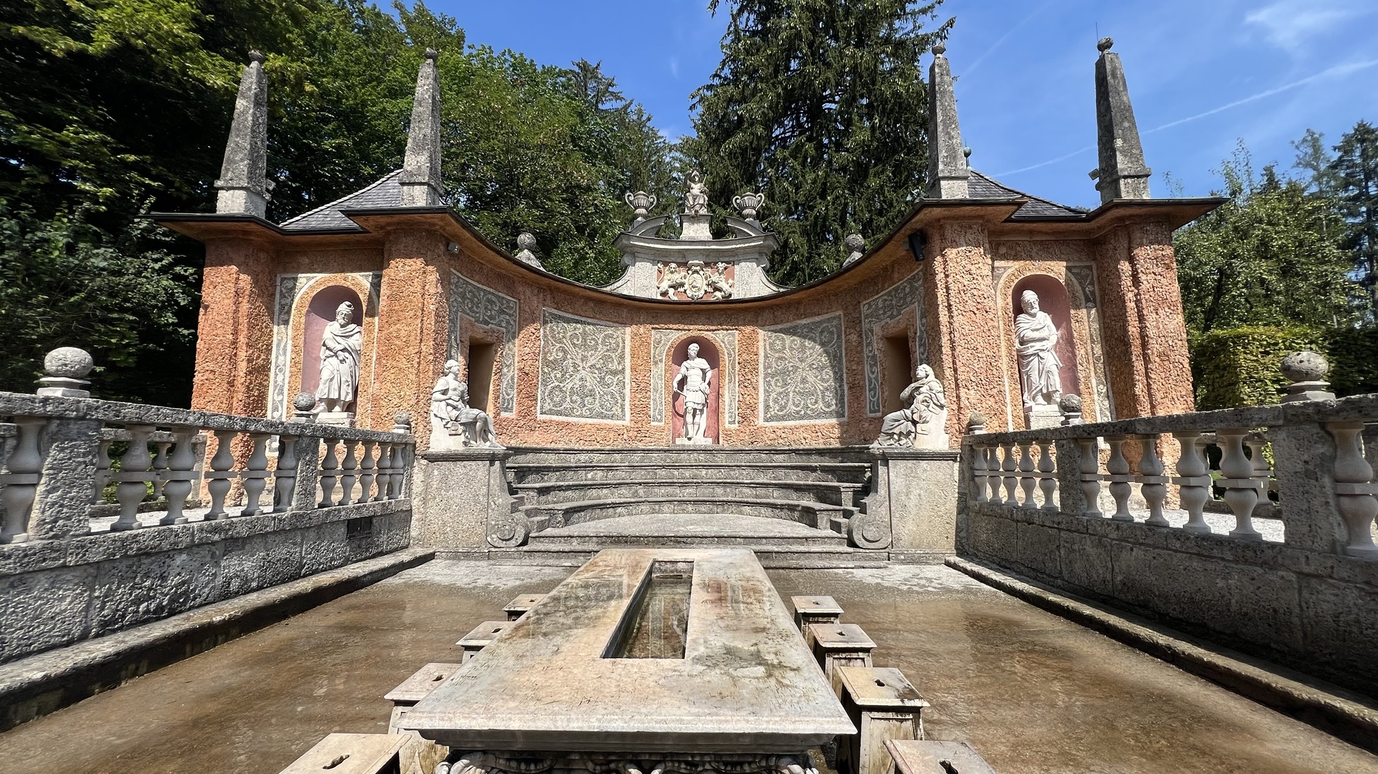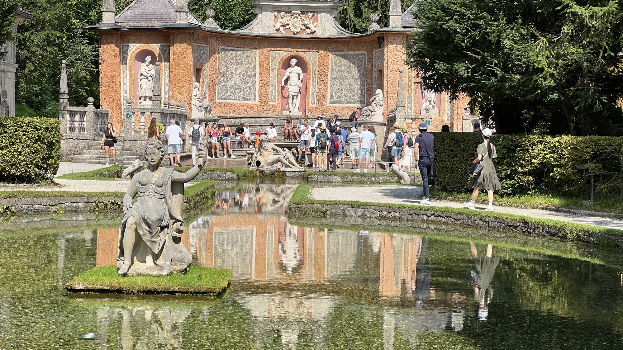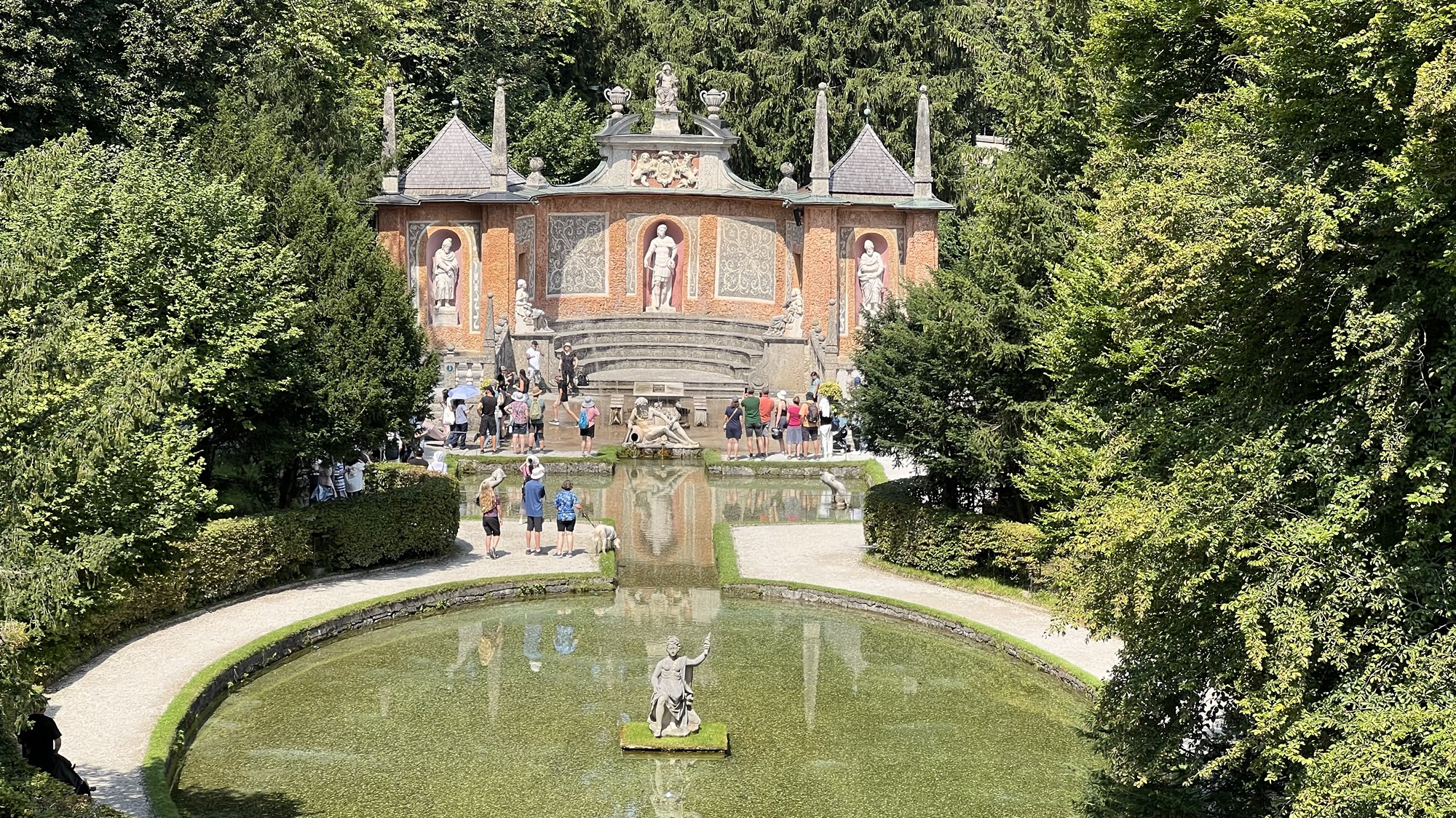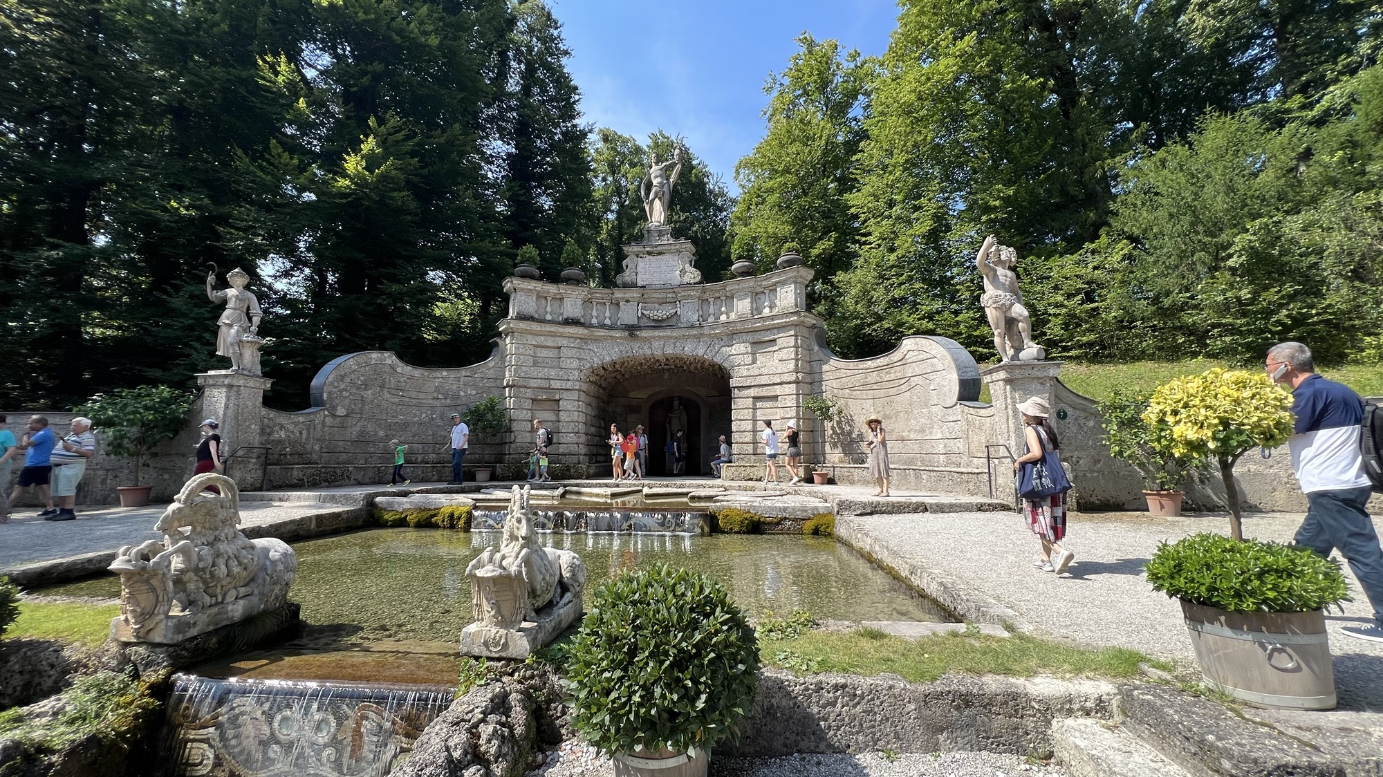 Nach dem Frühstück ging es los zum ersten Teil der Sight Seeing Tour durch Salzburg. Als erster Punkt stand das Schloß Hellbrunn und die dazugehörigen Wasserspiele auf dem Programm. Dank der Salzburg-Card konnten wir kostenlos im klimatisierten Bus vom Campingplatz mit einmal Umsteigen direkt zum Schloß fahren.