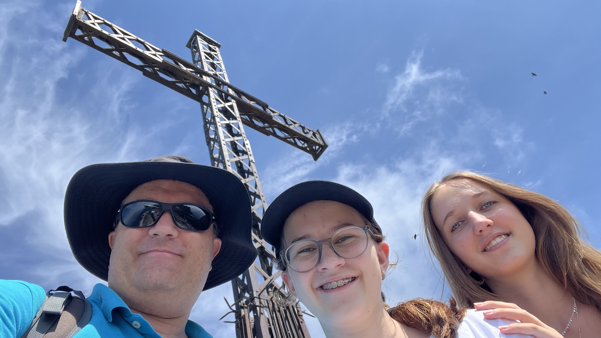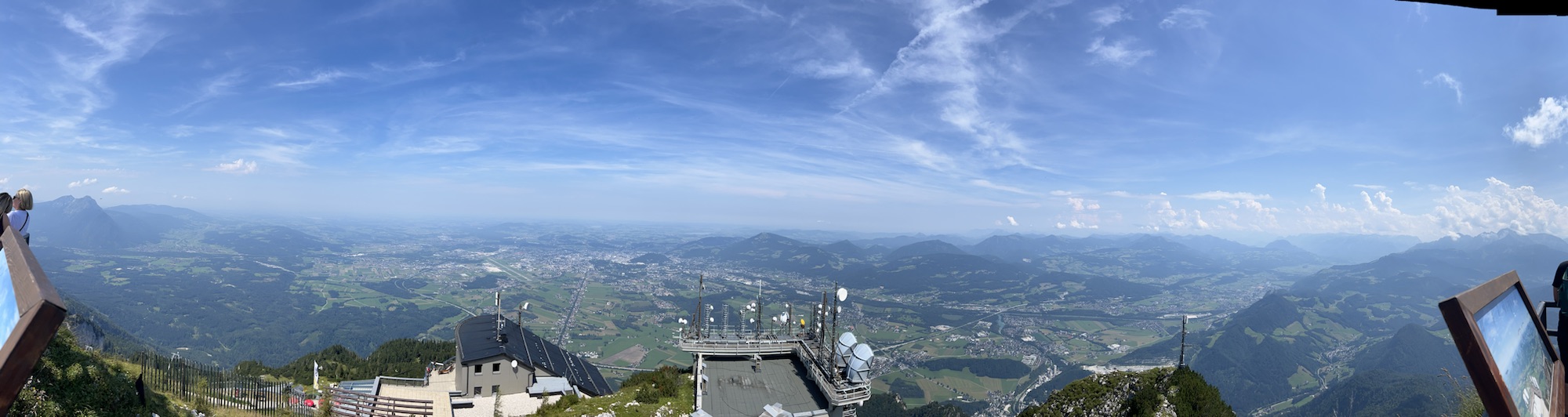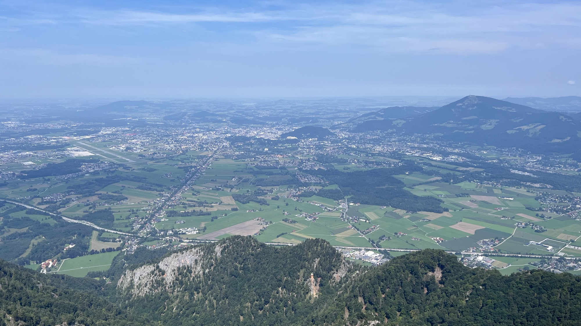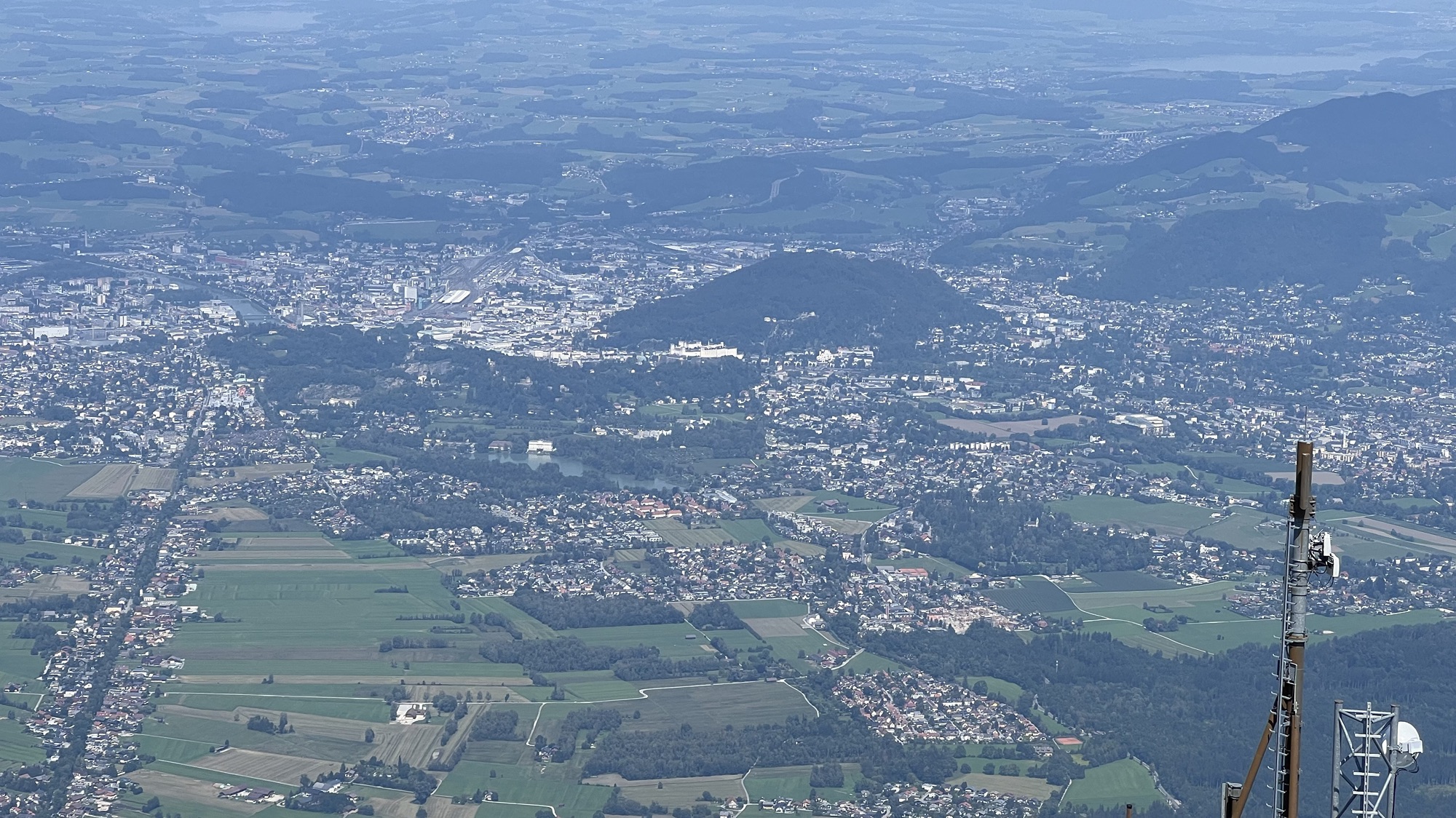 Nach ca. 2 Stunden Aufenthalt in Hellbrunn entschieden wir uns hoch hinaus zu fahren. Wieder mit dem Bus – bei 30 Grad Außentemperatur immer eine nette (klimatisierte) Abwechslung – ging es zur Talstation der Untersbergbahn. In ca. 8,3 min ging es von 456 m auf 1776 m. Dort angekommen erreichten wir nach einer minimalen Wanderung das Gipfelkreuz des Geierecks auf 1805 m.